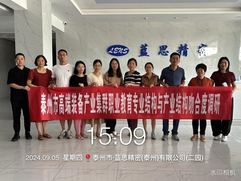 智能制造学院开展泰州市高端装备产业集群职业教育专业结构与产业结构吻合度调研 发布时间:2024-09-10 浏览次数:10 2024年9月5日下午,智能制造学院张斌院长带队赴蓝思精密(泰州)有限公司开展泰州市高端装备产业集群职业教育专业结构与产业结构吻合度调研。了解泰州市高端装备产业集群的发展现状、未来趋势及人才需求状况,进一步提升学校服务地方经济社会发展的能力,落实学校党代会关于“服务地方进一步增效,大幅提升毕业生在泰实习、就业率”的要求,培养“用得上、立得住”的一线人才、技术工人,促进我校毕业生更加充分更高质量留泰就业,为分院优化专业设置、调整人才培养方案、加强校企合作等提供科学依据。
