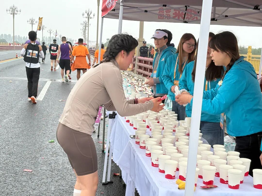 服务中,志愿者们将暖心融入每个细节。他们用“掌心托瓶身、四指托底”的规范手势稳稳递出补给。面对不同状态的跑者,他们灵活调整:对加速而过的选手侧身递补、手臂微抬以适配节奏;对慢步调整的选手则身体前倾,轻声道一句“加油”。在物资消耗飞快的时段,志愿者们两人一组,默契配合,一人专注递补保持手势稳定,一人迅速整理,确保补给点始终高效有序。当选手们穿行于“河有万湾多碧水,田无一垛不黄花”的美景中,这份贴心服务更显珍贵。