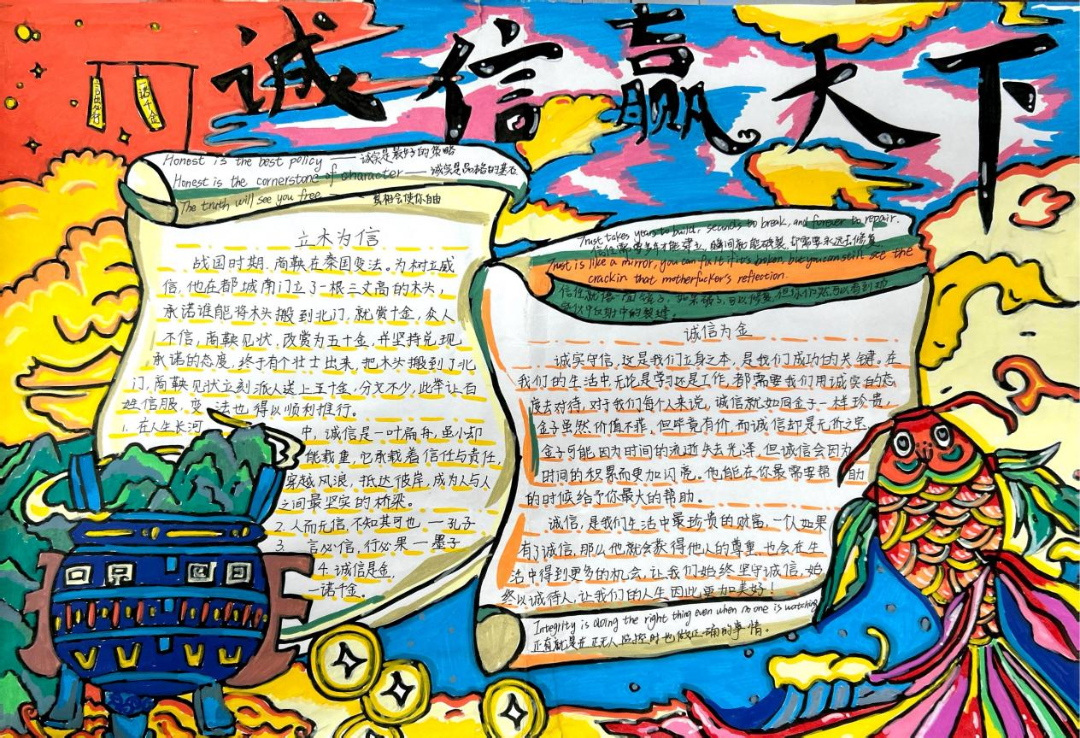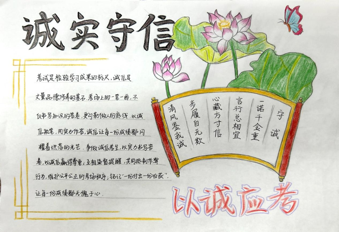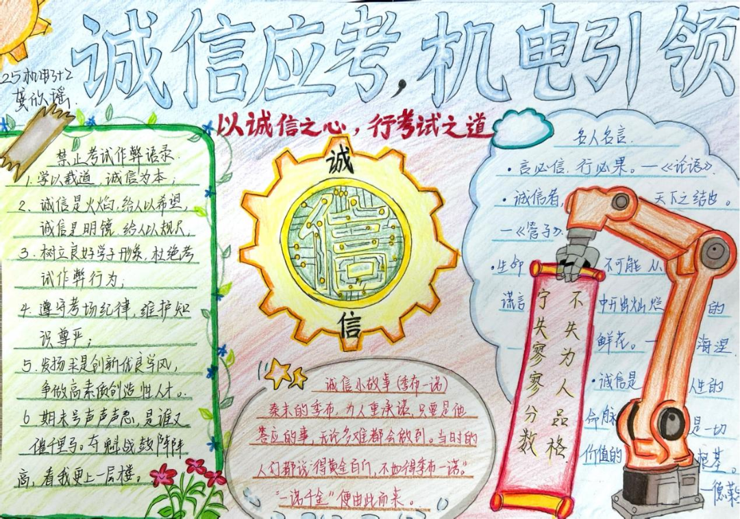 活动期间,各班级围绕主题,广泛征集手抄报、海报、书法等作品。同学们精心创作,作品内容丰富、设计美观、主题鲜明,在艺术的表达中传递诚信理念,在笔墨的勾勒中展现责任担当。本次诚信主题作品创作活动让“诚信”二字不再抽象,而是成为看得见、触得到的青春表达,也为诚信教育注入了持久而深厚的生命力。