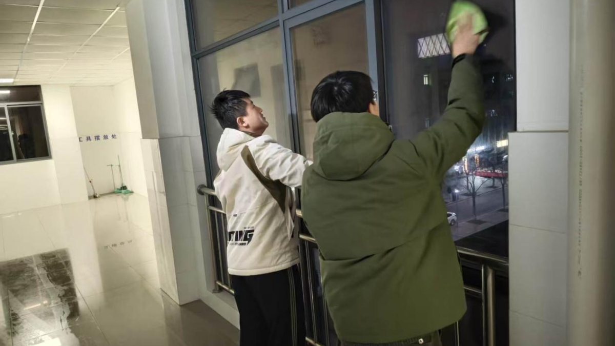 走进各宿舍楼,同学们正分工协作,忙而有序。书桌前,大家将散落的书籍与生活用品逐一归位,整理得井井有条。在厕所、水池、洗漱台等卫生死角,同学们俯身挥汗,清除污渍,疏通积水。一番清扫后,宿舍的窗台映出亮光,地面洁净清爽。