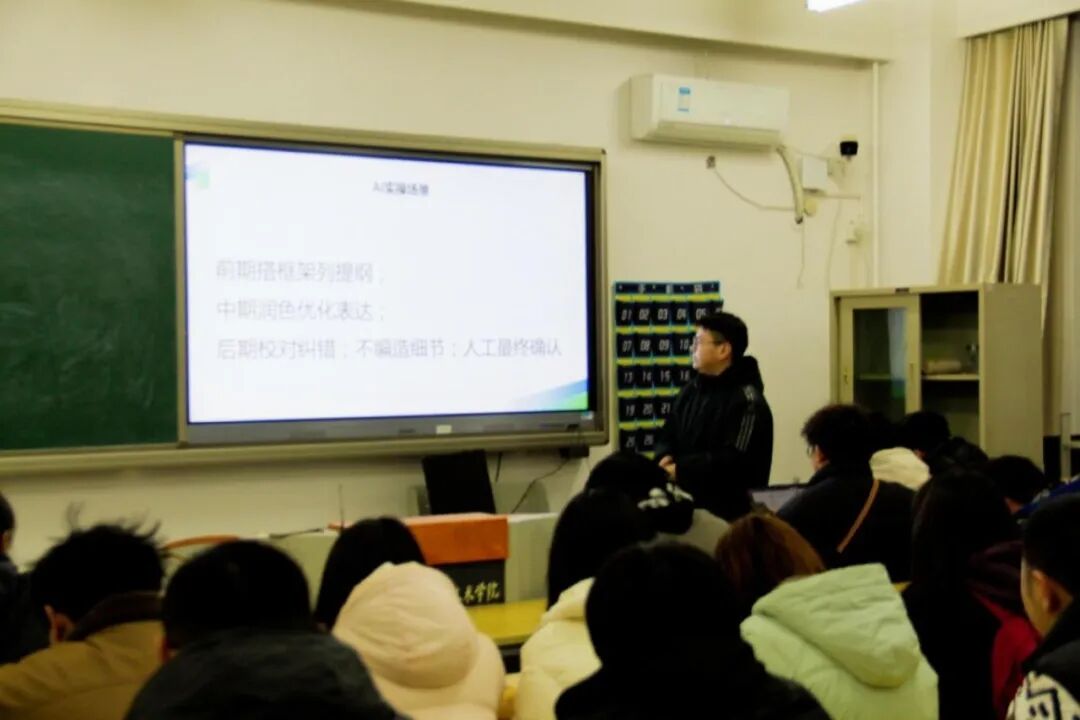 文策部部长范涟生重点讲解通讯稿写作的5W1H1C核心要素,结合实例拆解写作逻辑,同时分享AI辅助写作技巧,着重强调新闻创作的真实性底线,引导大家坚守原创原则;采编部部长仲柯嘉系统传授采编工作五步法,从素材搜集、筛选整理到后期呈现,明确各环节实操要求,同时讲解跨部门协同配合的技巧,助力提升工作效率;视觉部部长张宋炜聚焦拍摄构图、光线运用等实用技巧,细致演示设计软件操作流程,深入解读视觉表达的核心要点,帮助同学们提升画面呈现能力。